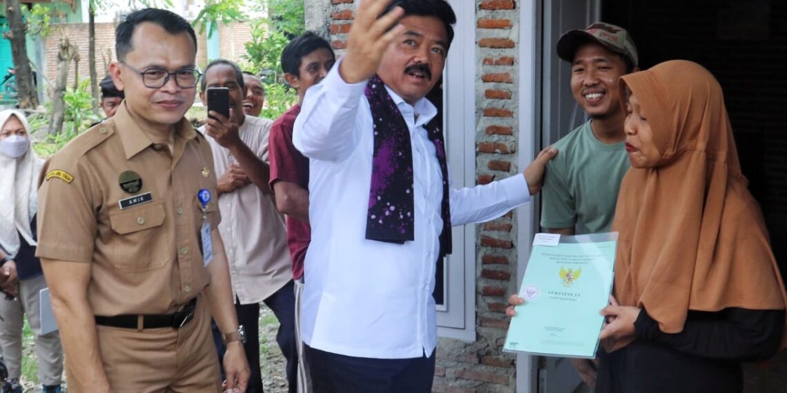 Talang – Menteri Agraria dan Tata Ruang/Kepala Badan Pertanahan Nasional (ART/BPN) Republik Indonesia Hadi Tjahjanto menyerahkan 34 sertipikat tanah secara langsung ke rumah-rumah warga penerima manfaat program Pendaftaran Tanah Sistematis Lengkap (PTSL) di Desa Bengle, Kecamatan Talang, Senin (15/01/2024).