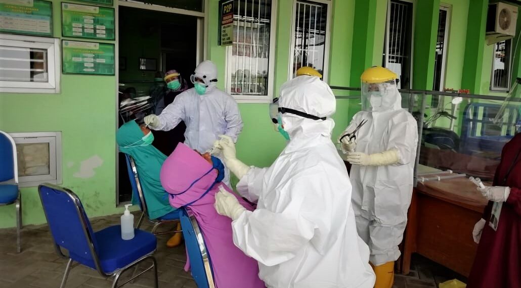 Proses pengambilan spesimen swab pada kontak erat kasus terkonfirmasi psoitif Covid-19 oleh petugas kesehatan.