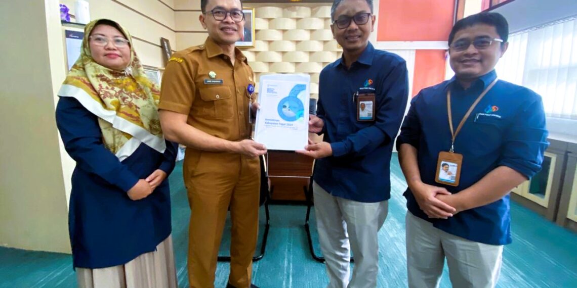 Sekretaris Daerah (Sekda) Kabupaten Tegal Amir Makhmud (kedua dari kiri) menerima rilis data statistik kemiskinan Kabupaten Tegal 2024 dari Kepala Badan Pusat Statistik (BPS) Kabupaten Tegal Bambang Wahyu Ponco Aji di ruang kerja Sekda, Senin (29/07/2024).