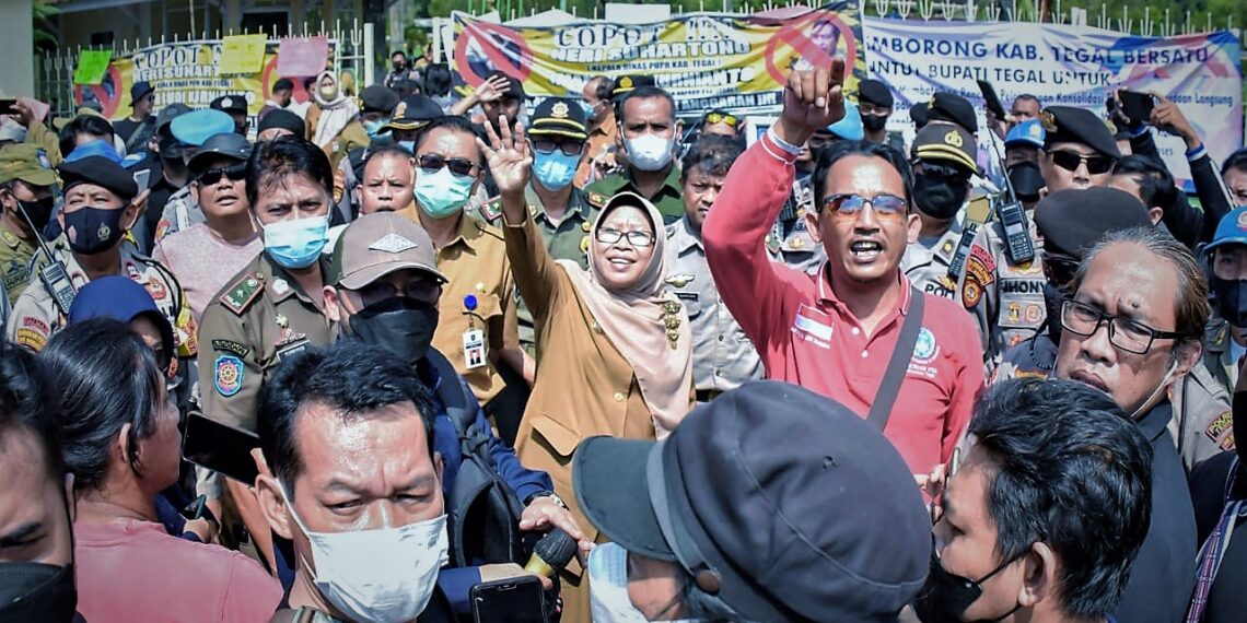 Slawi – Bupati Tegal Umi Azizah mengatakan tidak semua paket pekerjaan konstruksi di bawah pagu Rp 200 juta dikonsolidasi pada pengadaan barang dan jasa Pemkab Tegal tahun ini. Pernyataan tersebut disampaikannya saat menerima perwakilan warga pendemo yang menolak kebijakan konsolidasi di Ruang Rapat Bupati, Senin (20/06/2022).