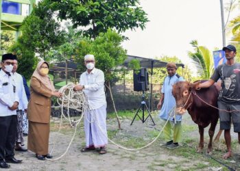 Slawi - Bupati Tegal Umi Azizah menyerahkan satu ekor sapi kurban ke pengurus Masjid Agung Kabupaten Tegal pada Senin (11/07/2022)...