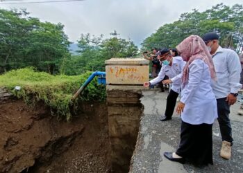 Balapulang - Bupati Tegal Umi Azizah tinjau Jembatan Gintung yang terputus di Desa Batuagung, Kecamatan Balapulang, Rabu (02/02/2022) pagi. Putusnya...