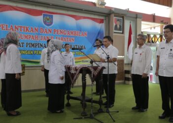 Slawi - Bupati Tegal, Umi Azizah mengambil sumpah jabatan dan melantik lima pejabat pimpinan tinggi pratama atau eselon II di ...