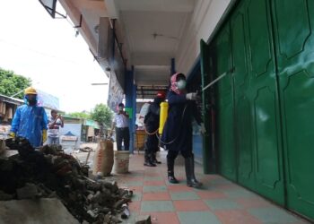 Slawi - Cegah penyebaran infeksi virus Corona di wilayahnya, Bupati Tegal Umi Azizah turun tangan lakukan penyemprotan di kawasan Ruko ...