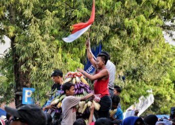 Slawi - Ribuan warga berebut gunungan hasil bumi pada acara Kirab Pataka Hari Jadi Ke-148 Kabupaten Tegal, Jumat (17/5) siang ...